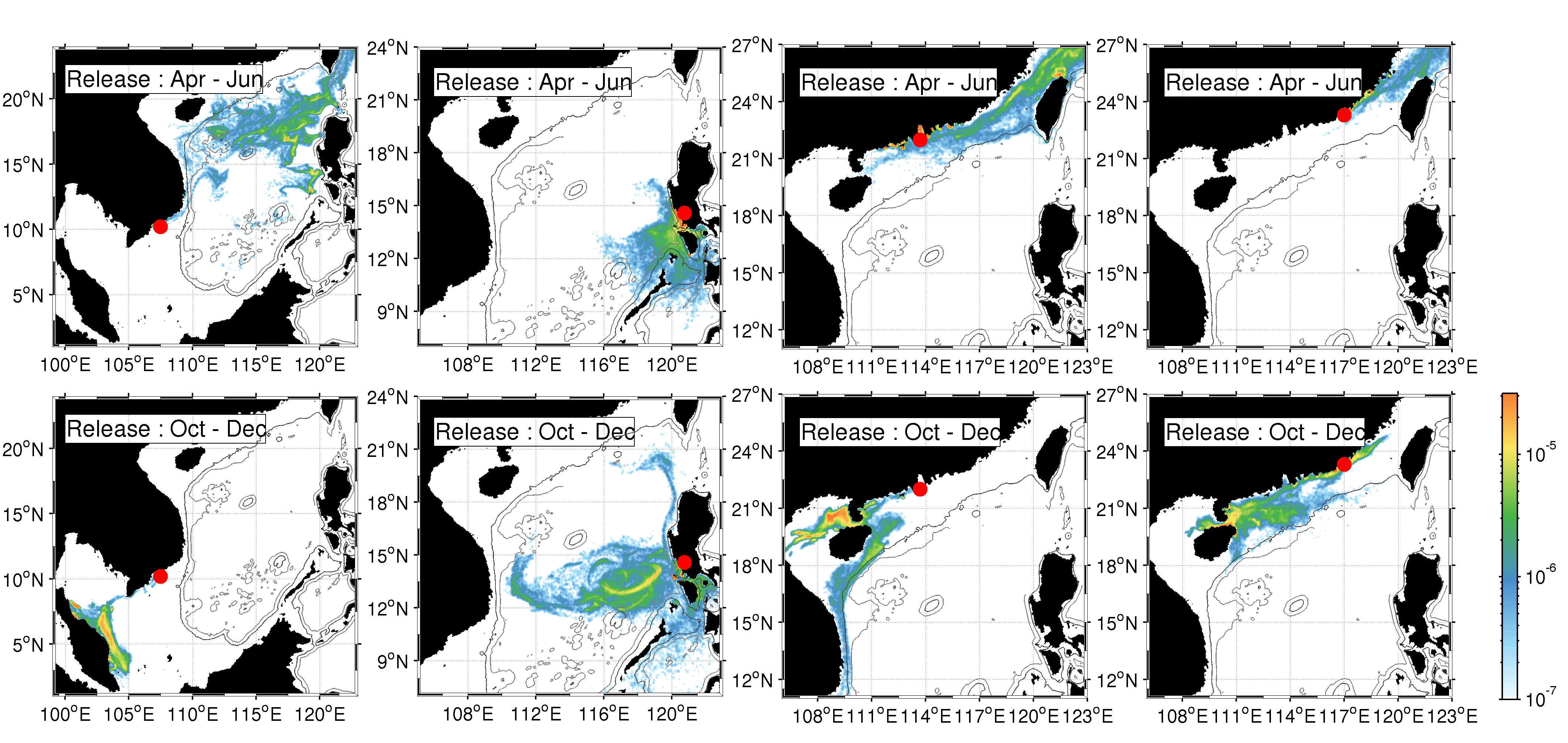 琉球諸島南西部の西表島と石垣島周辺と石西礁湖に設置した145個のパッチからサンゴの産卵を模擬するために5月の満月大潮の翌日を中心とした前後1週間(計14日間)の夜間に1日1回particle粒子を放出し,21日間後(移流時間)まで追跡した.2012年から2015年までの4ケースの計算結果から,Lagrangian PDFの移流時間積分値を算出した.多くの粒子は,石西礁湖周辺に留まるが,一部の粒子は黒潮に輸送されて移流時間21日以内に,九州南岸まで到達することがわかった.
