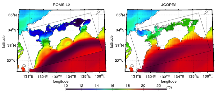 具体的には,データ同化された西太平洋海域渦解像海洋モデルJCOPE2(Miyazawaら,2009)から開始し,ROMS(Regional Oceanic Modeling System,Shchepetkin & McWilliams,2005)を用いて合計3段階でダウンスケールする.つまり,JCOPE2(解像度約10km)→ROMS-L1(同2km) →ROMS-L2(同500m)と順次入れ子状に領域を収斂させ,外洋からの地球規模環境シグナルを取り込みつつ,微細な地形特性や内因的なサブメソスケール渦などの乱流をも詳細に再現することの可能な枠組みを構築する.瀬戸内海流動に対して本質的な重要性を持つ河川からの淡水流入も当然ながら考慮しつつ,15年間の再解析を実施する.また,2年目以降には,ラグランジュ粒子の時間逆行計算と水質-生態系モデルとのカップリングを行い,浅海生物の起源および黒潮を考慮した瀬戸内海生物ネットワーク形成について調査,流れの相関を評価することにより,戦略的な内湾環境保全計画の策定に直接貢献することをプロジェクト全体のゴールとして設定している.