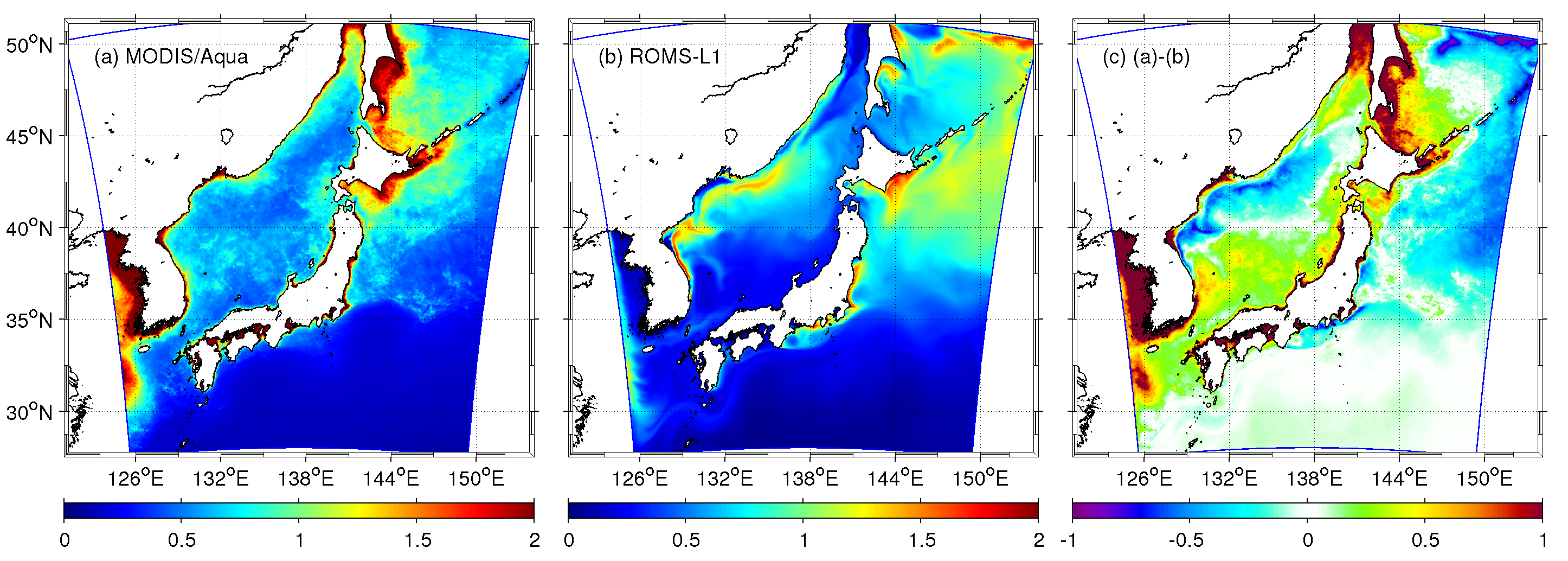 富栄養な内湾域とは異なり,外洋における一次生産は一般に極めて低い.我が国の太平洋沿岸を北進する黒潮暖水は陸棚周辺に強いフロントを形成し,そこでは温度風平衡に伴う鉛直シア,中規模渦による湧昇・沈降,表層水のsubductionなどが生じるため,貧栄養な外洋の中でも比較的高い生産性を維持する役割を果たしていると考えられている.外洋における一次生産の定量的な評価は,そこに接続する沿岸域の生態環境のみならず,ブルーカーボンの生成を通じて地球環境問題を考える上でも重要な課題である.そこで本研究では,領域海洋循環モデルROMSとNPZD型の生態系低次生産モデルをカップリングしたROMS-NPZDモデルを用い,中規模渦解像・サブメソスケール渦許容気候値解析を行い,太平洋沿岸黒潮域における一次生産に対する海洋変動の影響を評価した.