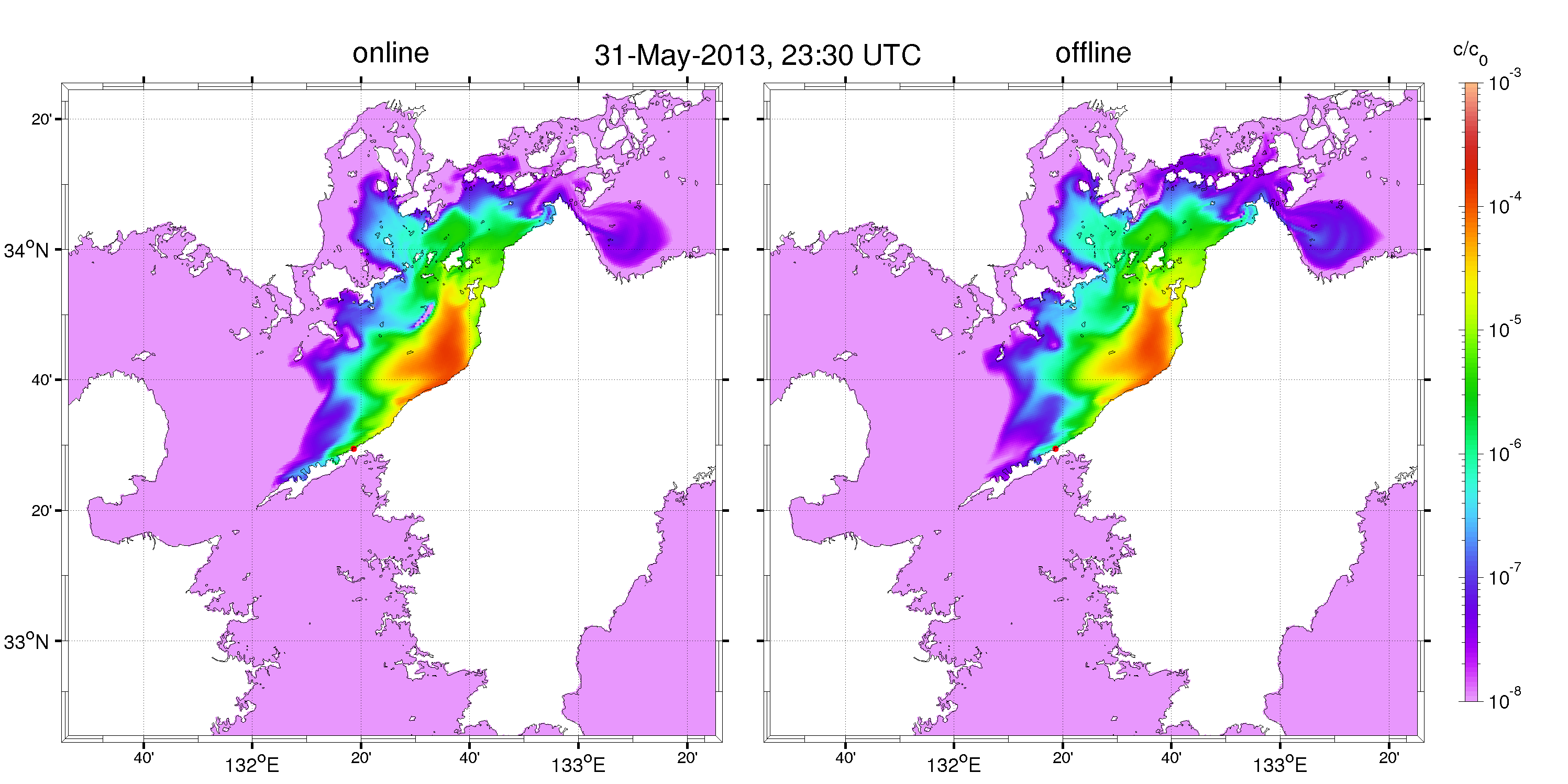 下水処理場や原子力発電所はそのほとんどが沿岸域に設置されており,そこからは日々,大量の排水が行われている.福島第一原発事故のように不測の事態によって万が一有害物質の放出などが起こると,沿岸環境や生態系に対して深刻な影響を及ぼす可能性があるため,そのような事態を早急に予測するシステムを準備しておく必要がある.本研究では,原理的に無限に想定可能な漏洩シナリオや,突発的な事故に対してできるだけ迅速に対応するために,予め計算された流動場を用いてtracer輸送を解くoffline passive tracerモデルを開発する.さらに,愛媛県佐田岬付け根に位置し,比較的早期の再稼働が予想される四国電力伊方発電所の沖側海域を想定ソースとしたtracerのEuler的な移流分散を取り上げ,季節的な分散パターンおよびそのメカニズムを検討する.offline passive tracerモデルとは,領域海洋循環モデルROMSのアルゴリズムに準拠し,海洋モデル再解析値や予報値を用いてpassive tracerの3次元移流拡散方程式を解き,物質の保存的な輸送を求めるプログラムである.点源からの湧き出しや吸い込みを考慮できるように設計されており,任意の地点,時刻からtracerフラックスの流入などを取り扱うことができる.さらに,海水流動とtracer輸送を同時に計算するonline計算と比べて,数十倍の速さで計算することが可能である.