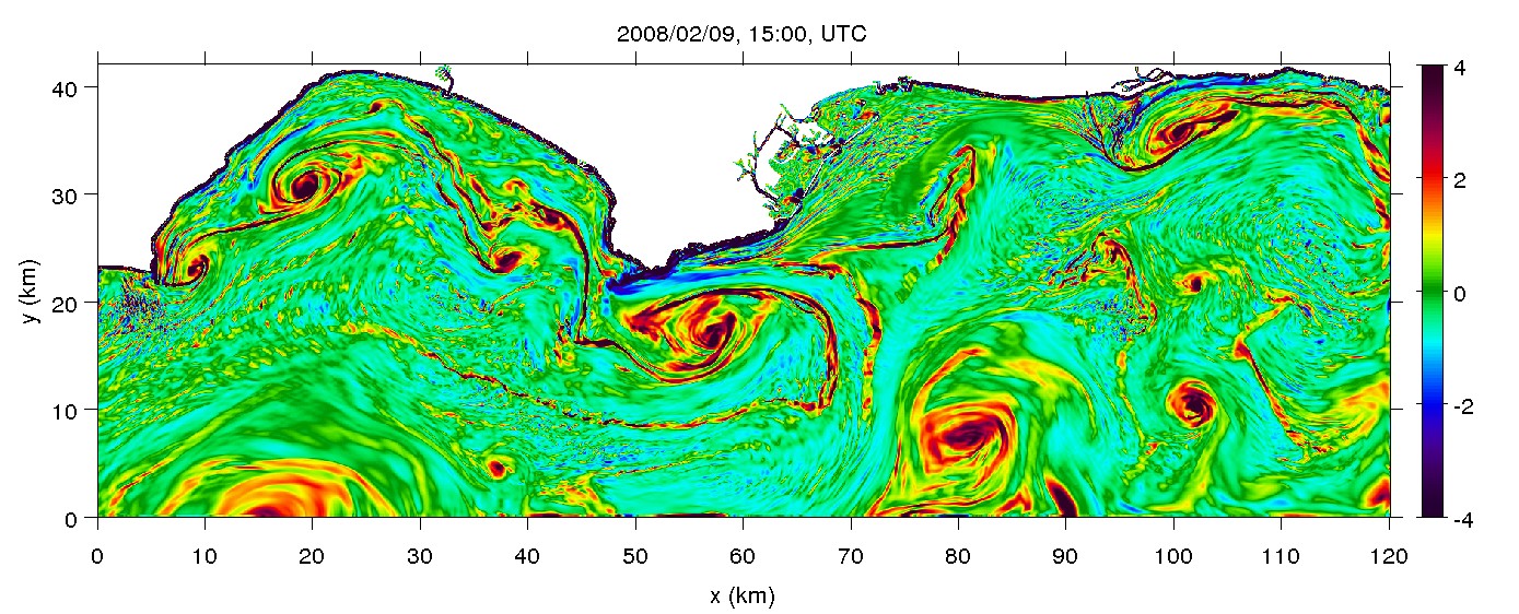 そこで,ROMS-WECにスペクトル波浪モデルSWANと領域気象モデルWRF をカップリングさせ, 多段階のネスティングによる精緻なダウンスケーリング実験を行い,中規模およびサブメソスケールの現象が支配的な陸棚循環流に対する波浪の影響を定量的に評価することを試みた.本研究では,南カリフォルニア湾における陸棚循環流を対象に,海盆スケールの力学バランスに支配された海流などの外洋シグナルの波及,サブメソスケール力学,潮汐,風波,局地気象,海底地形・海岸線地形などの影響を厳密に考慮しつつ,沿岸海洋流動に対する保存的な波-流れ相互作用の影響を詳細に検討した.